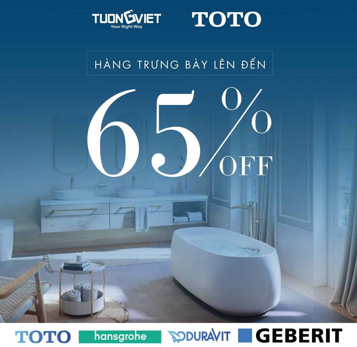 Từ ngày 14/01/2022, Showroom Tường Việt bùng nổ ưu đãi “Chào đón năm mới 2022” lên đến 65% cho tất cả sản phẩm trưng bày thuộc các thương hiệu nổi tiếng trên thế giới như TOTO, Duravit, Hangrohe, Geberit… diễn ra tại 125 Cách Mạng Tháng 8, phường Bến Thành, quận 1, Thành phố Hồ Chí Minh. Đây là sự kiện khuyến mại lớn nhất năm cho các sản phẩm thiết bị vệ sinh có mặt tại Showroom.